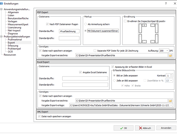 Ideagen Quality Control-Fenster „Einstellungen“ > „Export“. Wählen Sie unter